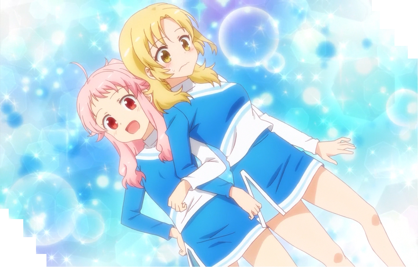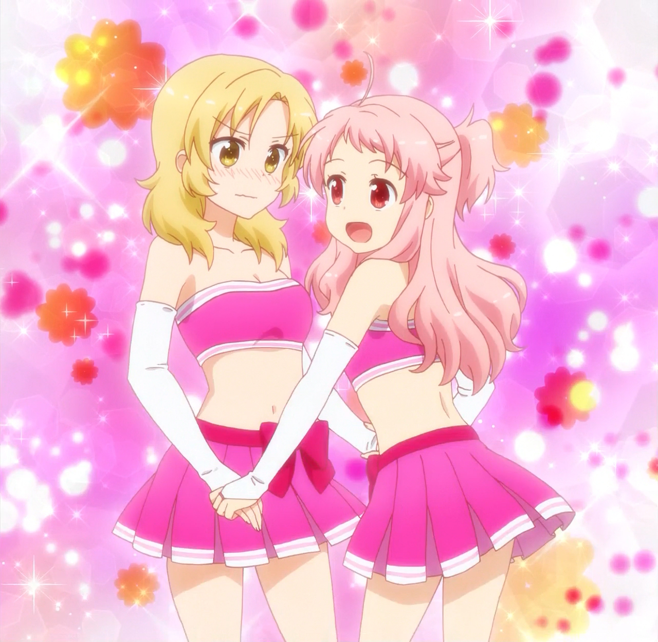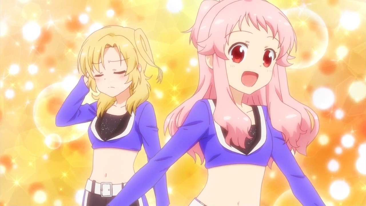 The next day, Hizume, Kotetsu, Kohane and Uki visit the to buy supplies to make pom-poms. While eating lunch, Hizume reveals that she wants to get along with her classmates more. She decided to hand out pom-poms while smiling to the girls. While the girls seemed scared, this change when Kohane hugs Hizume. They became jealous at Kohane for hogging Hizume. Either way, Hizume’s classmates started getting along with her. When Uki, Kotetsu and Kohane went up to their club room, a pink-haired girl came out. She seems annoyed that Hizume is in the Cheer Association.